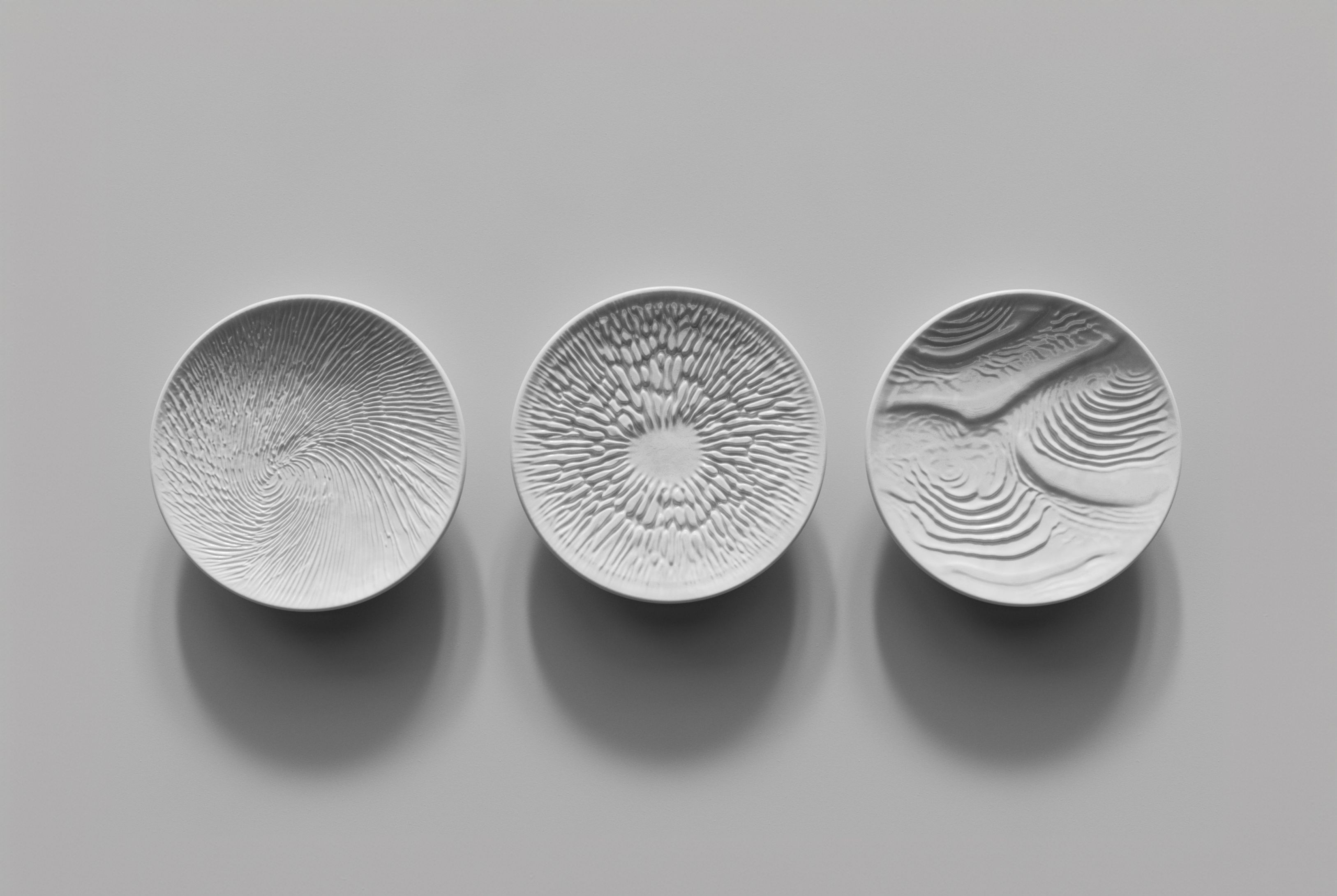 So können sowohl zufällige Bilder, 3D Dateien oder Texturen erzeugt werden, aber auch genaue Vorgaben gemacht werden, um die Ergebnisse steuern zu können. Die generierten Texturen werden als Displacement Mapping verwendet, um ein Mesh eines flachen Tellers zu manipulieren, welcher im Anschluss 3D gedruckt wird. Mithilfe von Porzellankernguss wurde das finale Produkt realisiert. Die Teller servieren keine Speise sondern neue Formen des Arbeitens mit künstlicher Intelligenz.