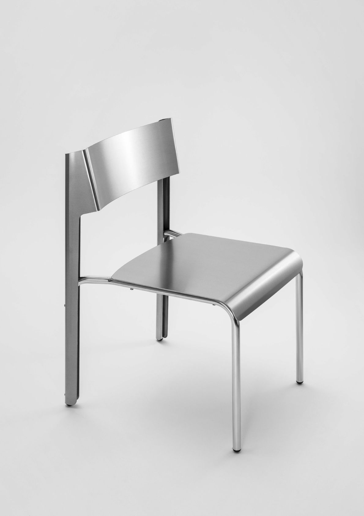 Die Rückenlehne demonstriert einige Eigenschaften von Aluminiumblech, wie Stabilität und Flexibilität in einem Werkstück. Der enge Radius verleiht den Beinen Steifigkeit und die offene, gerollte Lehne federt angenehm. Die Materialien bleiben blank und unbehandelt und werden mittels Nieten verbunden. Dieser Stuhl eignet sich für mittelgroße Serien und soll als Edition abseits des Mainstreams präsentiert werden.