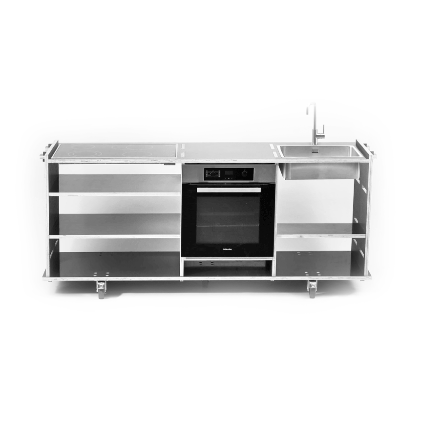 Im Herbst 2024 wurden große Teile des Tullnerfeld in Niederösterreich von einem Jahrhunderthochwasser überschwemmt. Durch den Wasserstand im Erdgeschoss waren die meisten Küchen unbrauchbar geworden. Ziel der 24er Küche ist es in Krisensituationen ein Stück Normalität wiederherzustellen. Das System ist auf Küchennormmaße angepasst und kann somit Einbau- geräte, die nicht beschädigt wurden, aufnehmen. Die 24er Küche besteht aus 24 mm CNC gefrästen Siebdruckplatten, ist schnell gefertigt, wiederverwendbar und mobil. Das simple Steck und Keil System sorgt dafür, dass die Küche auch von einer Person ohne Werkzeug in 24 Minuten aufgebaut werden kann.