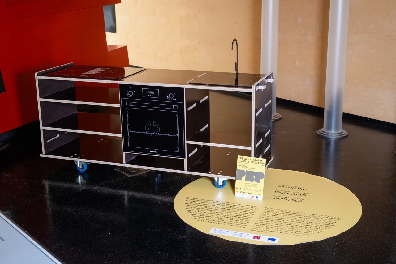 Im Herbst 2024 wurden große Teile des Tullnerfeld in Niederösterreich von einem Jahrhunderthochwasser überschwemmt. Durch den Wasserstand im Erdgeschoss waren die meisten Küchen unbrauchbar geworden. Ziel der 24er Küche ist es in Krisensituationen ein Stück Normalität wiederherzustellen. Das System ist auf Küchennormmaße angepasst und kann somit Einbau- geräte, die nicht beschädigt wurden, aufnehmen. Die 24er Küche besteht aus 24 mm CNC gefrästen Siebdruckplatten, ist schnell gefertigt, wiederverwendbar und mobil. Das simple Steck und Keil System sorgt dafür, dass die Küche auch von einer Person ohne Werkzeug in 24 Minuten aufgebaut werden kann.