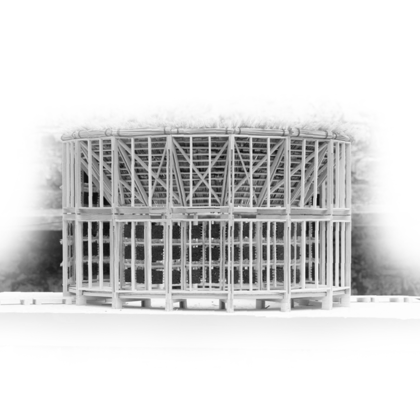 Inspiriert durch den Besuch eines Erdbeerhofs in Lim- burg, thematisiert dieses Projekt die Wiederverwendung von Abfalltorf, einem Nebenprodukt der Bio-Landwirt- schaft. Torfgebiete sind als „umgedrehte Regenwälder“ bekannt, weil sie große Mengen an CO2 speichern. Für die peatland rotunda wird gebrauchter Torf zu Platten für einen Pavillon zur Wiederbefeuchtung des Blaugraslands verarbeitet. In Anlehnung an die traditionelle Architektur von Feuchtgebieten besteht die Struktur aus vorgefertigten Bauteilen, die mit lokalen Materialien leicht zusammengesetzt werden können. Der Pavillon ist eine Hommage an Moorgebiete und die Vergänglichkeit der Architektur.